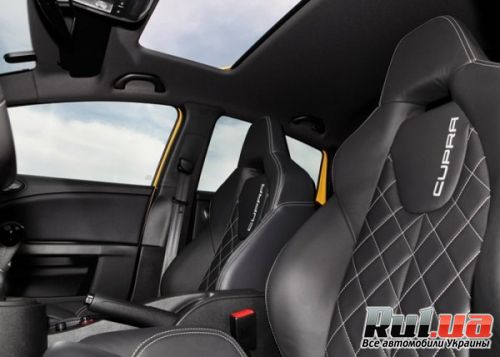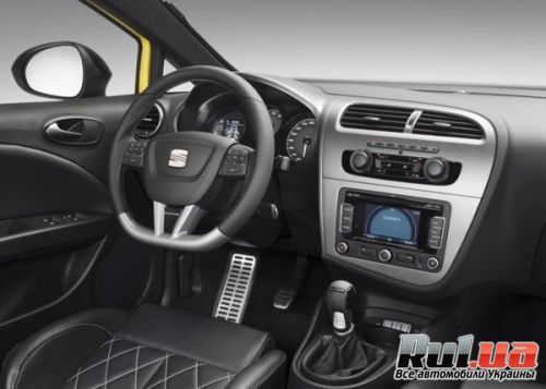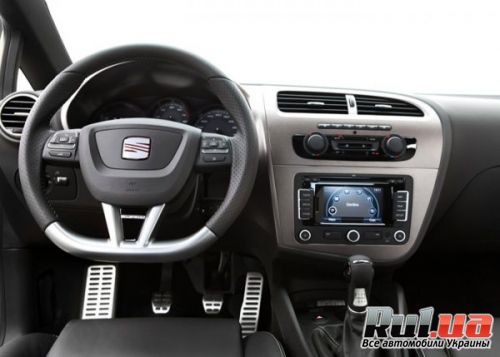 В Сеат Леон Купра, все элементы интерьера выражены в черном цвете, вместо обычных светлых тонов на других моделях. Черный кожаный руль с алюминиевыми вставками и логотипом «Cupra», обшитая кожей ручка передач, алюминиевые педали и настоящие спортивные сидения в виде ковшей переносят водителя в спортивный мир где хочется побеждать.